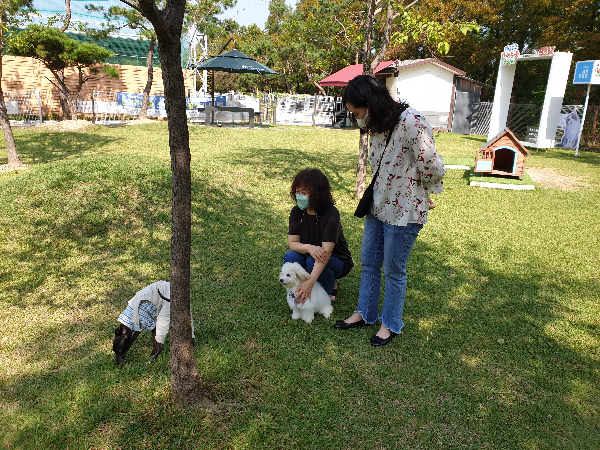 강아지와 놀아보라고 풀어놓아도 쭈뼛쭈뼛 내 옆에 꼭 붙어 안 가